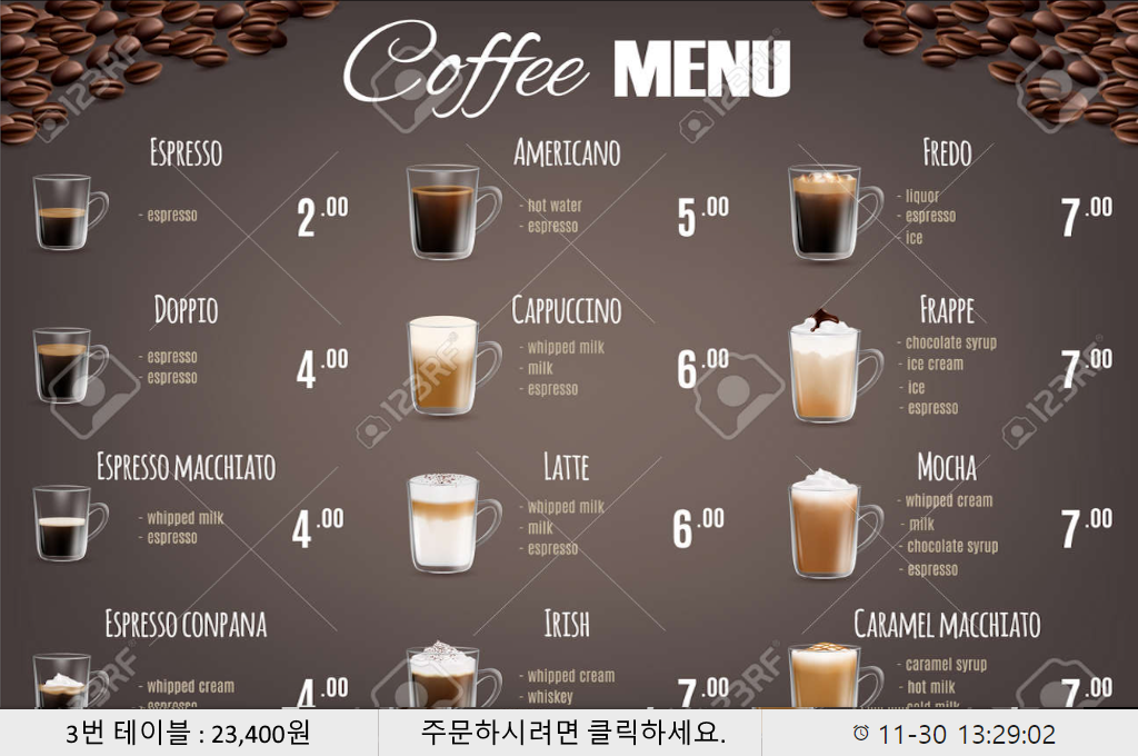 대형 LED 디스플레이를 천정부착이나 스탠드형으로 제공되며 메뉴판 및 광고/이벤트 정보를 제공합니다.